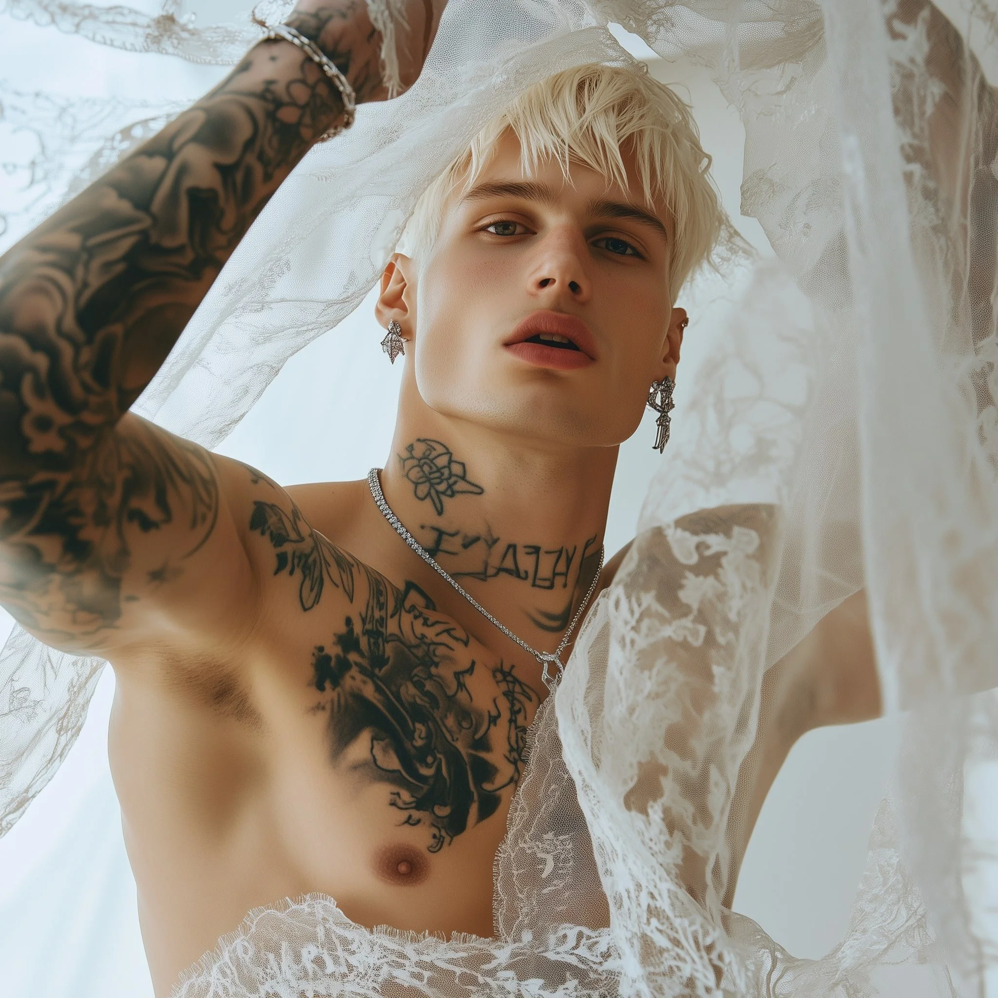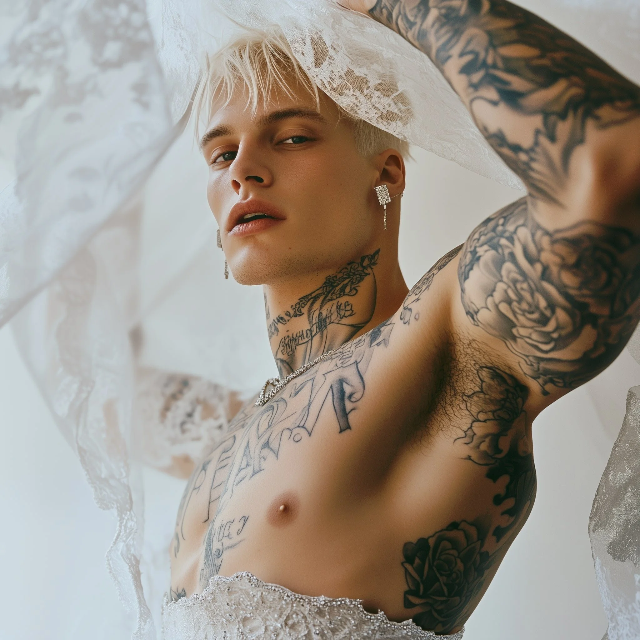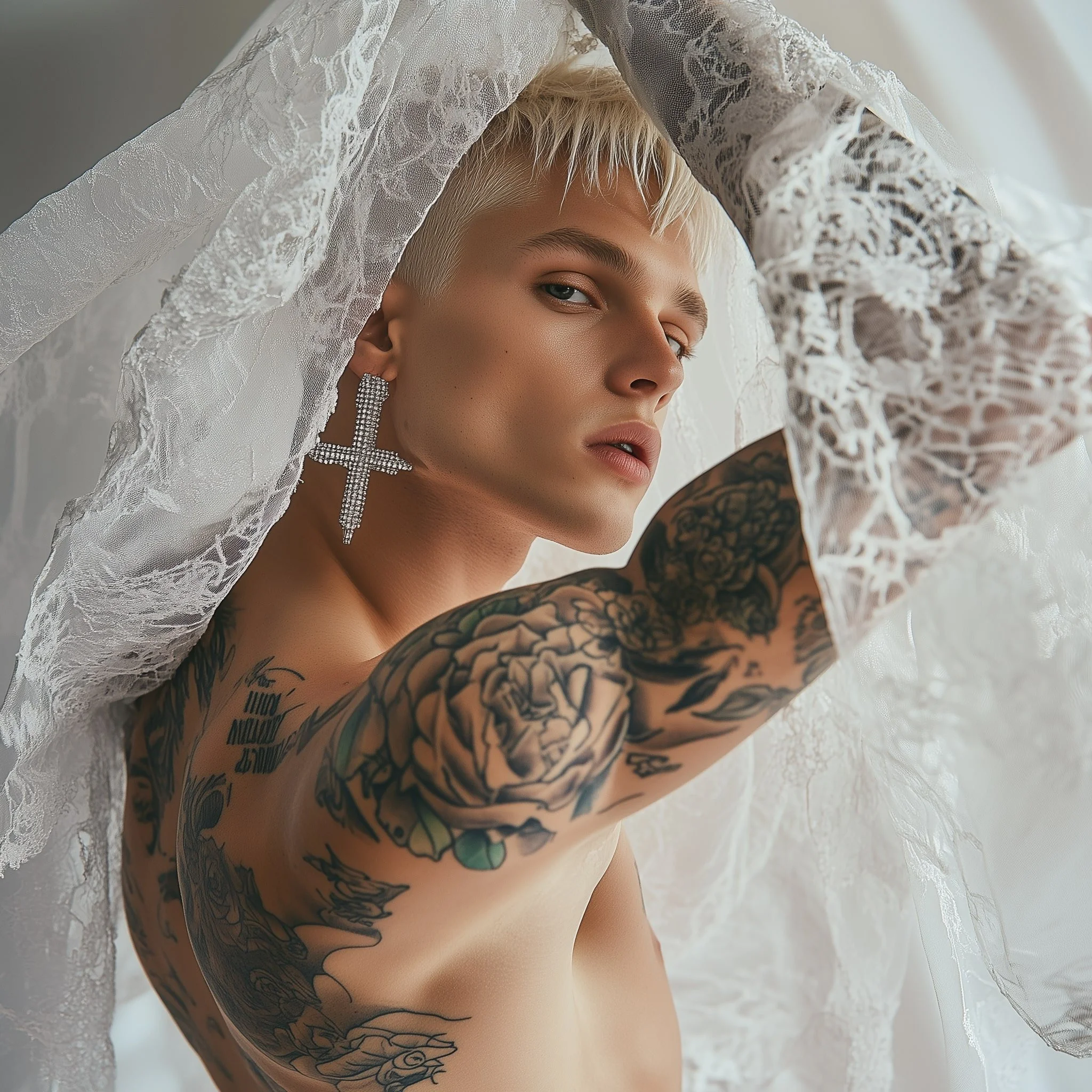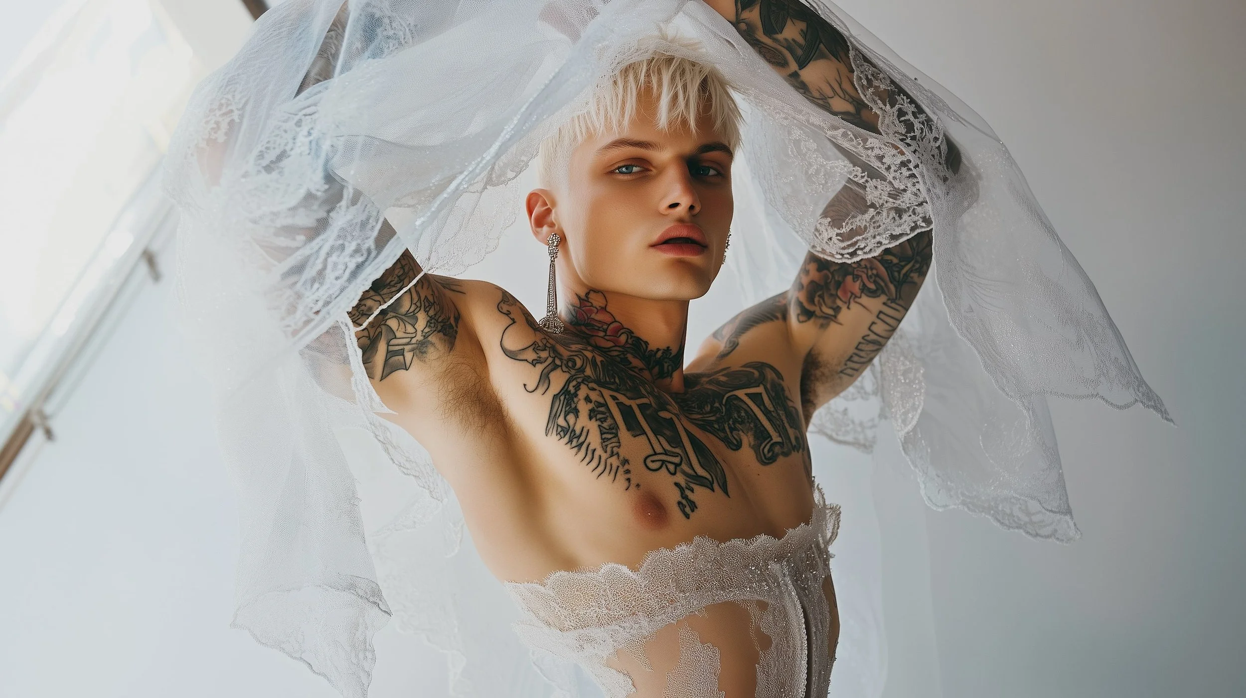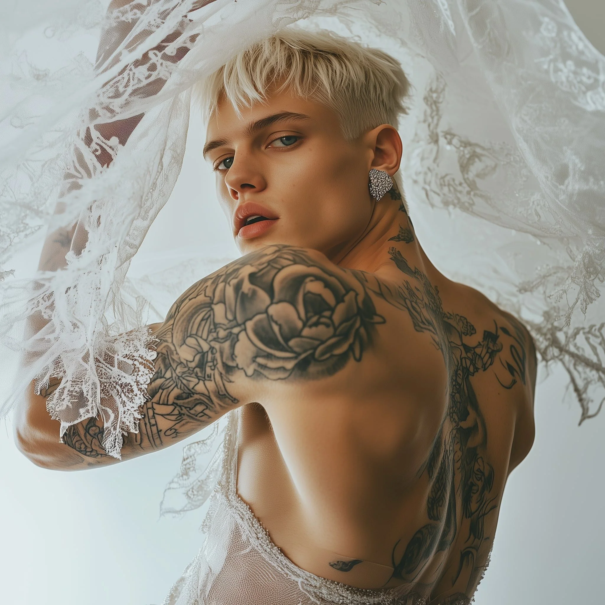 The sheer, bridal veil draped over his head is not a symbol of innocence, but a symbol of defiance. It's playful, sensual, and daring—reflecting the new-age masculinity that Matteo Adrien has crafted for this generation. The model engages with the camera provocatively, unapologetic in his challenge of tradition. His playful gaze dares the viewer to look deeper, to ask why men have not yet claimed their space in the bridal world.